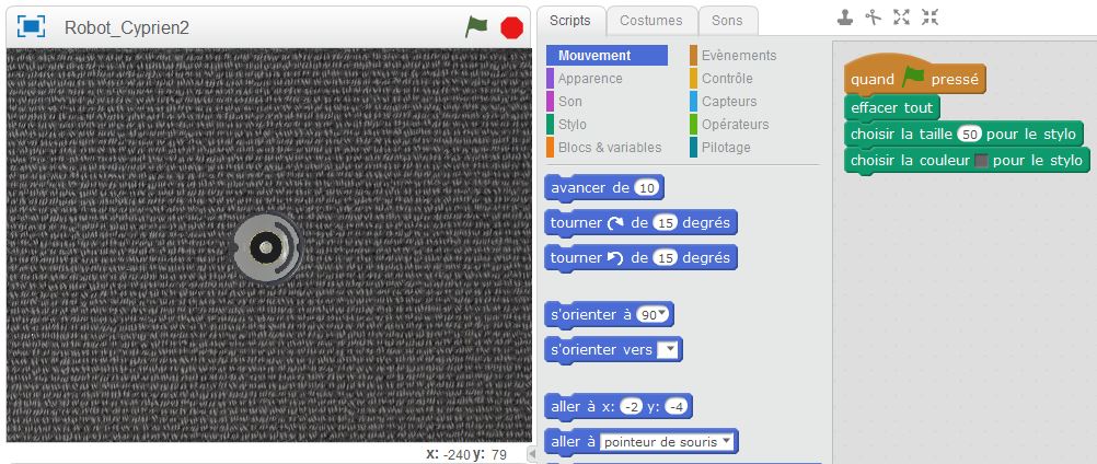 Pour déplacer le robot avec la souris, placez les les deux blocs suivant à l'intérieur d'une boucle qui ne s’arrête pas.